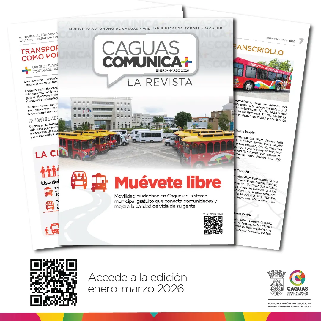 🚍 En esta edición encontrarás el tema “Muévete libre”, enfocado en la movilidad ciudadana en Caguas y el sistema municipal gratuito que conecta comunidades y contribuye a mejorar la calidad de vida de nuestra gente.