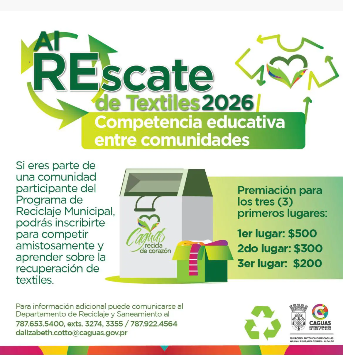 El Municipio Autónomo de Caguas, a través del Departamento de Reciclaje y Saneamiento, invita a las comunidades participantes del Programa de Reciclaje Municipal a formar parte de esta iniciativa educativa que promueve la correcta disposición y recuperación de textiles.