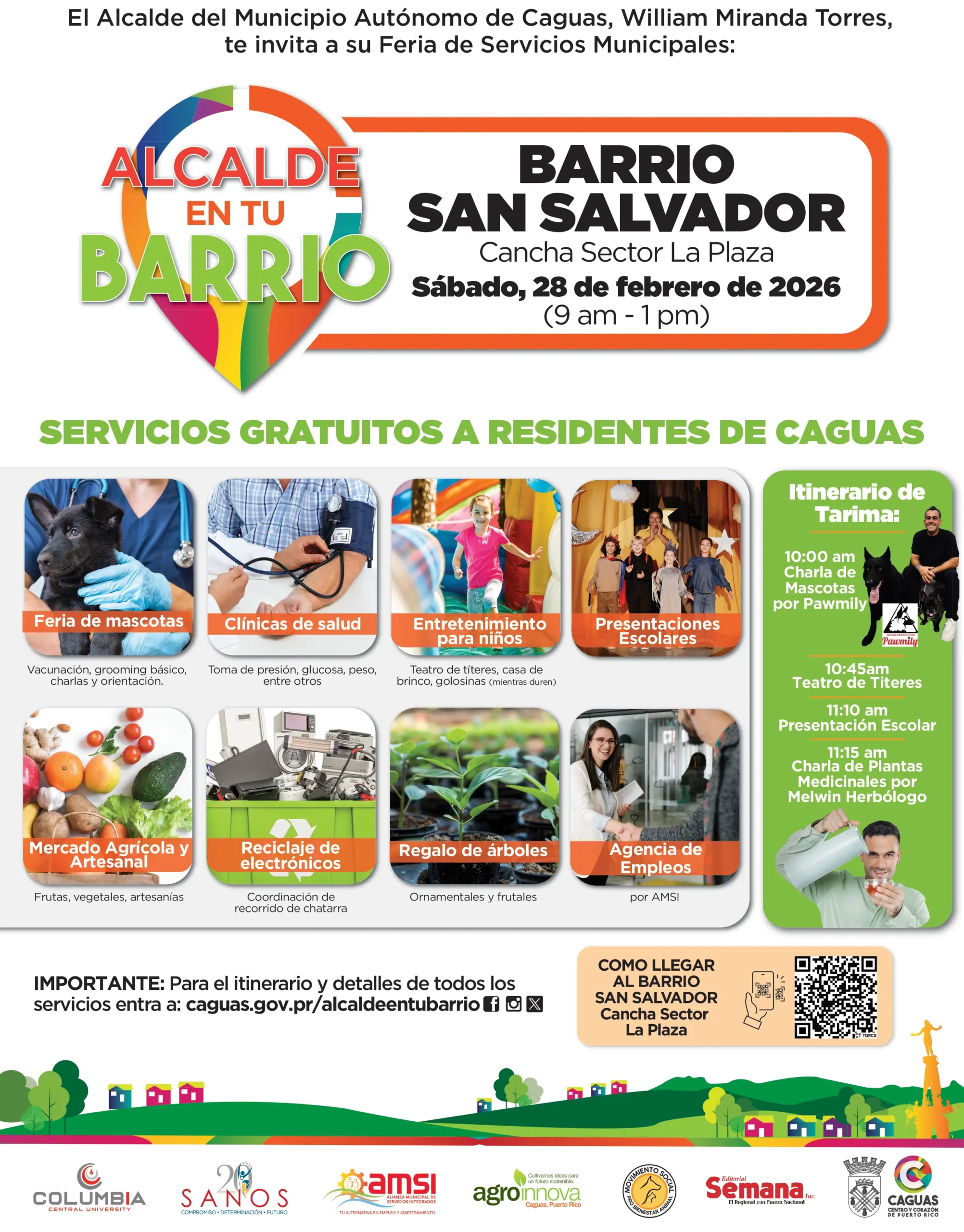 El Municipio Autónomo de Caguas invita a todos los residentes a disfrutar de una gran Feria de Servicios Municipales el sábado, 28 de febrero de 2026, en las facilidades de la Cancha Sector La Plaza, de 9:00 am a 1:00 pm. 🙌