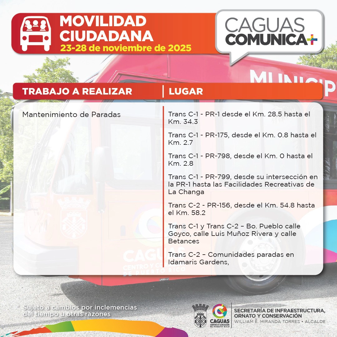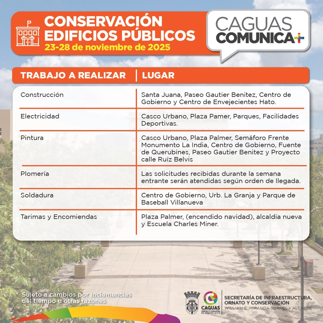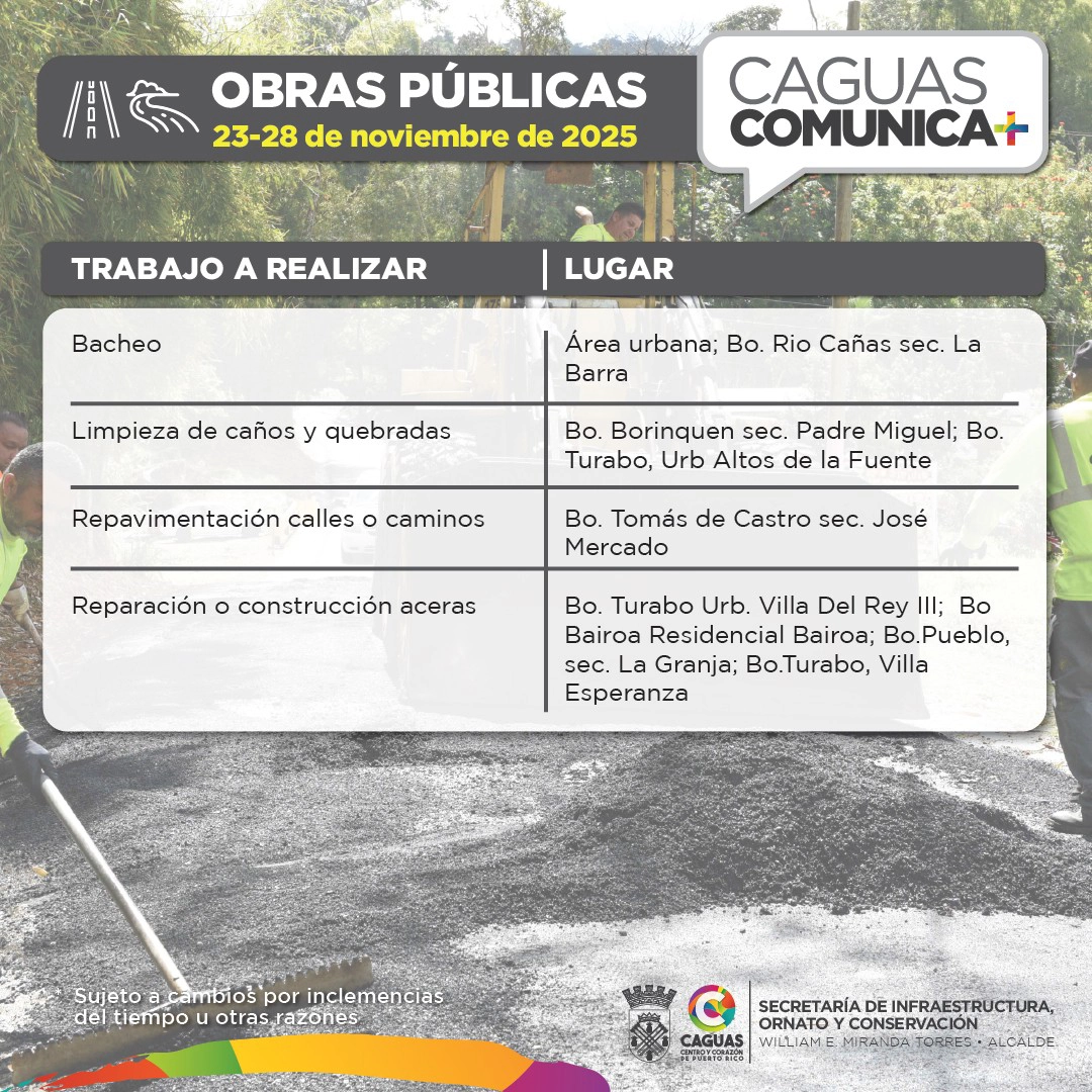En Caguas, seguimos trabajando por una ciudad limpia, ordenada y funcional. Conoce las labores programadas para la semana del 23 al 28 de noviembre de 2025, de la Secretaría de Infraestructura, Ornato y Conservación (SIOC)