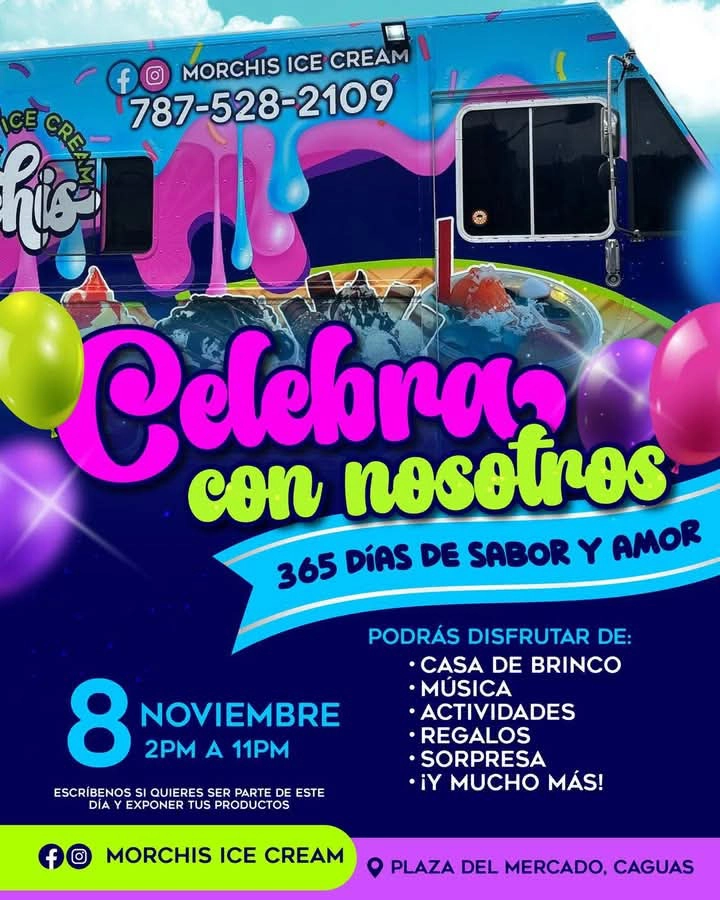 Este 8 de noviembre 📅, desde las 2:00 p.m. hasta las 11:00 p.m., acompáñanos en la Plaza del Mercado de Caguas para disfrutar de una experiencia única junto a Morchis Ice Cream.