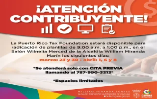 La Puerto Rico Tax Foundation ofrecerá servicio en el Salón Wilnelia Merced de la Alcaldía William Miranda Marín de 9:00 a.m. a 1:00 p.m. los días 23 y 30 de marzo, y 1, 6 y 8 de abril. La atención será solo por cita previa llamando [...]