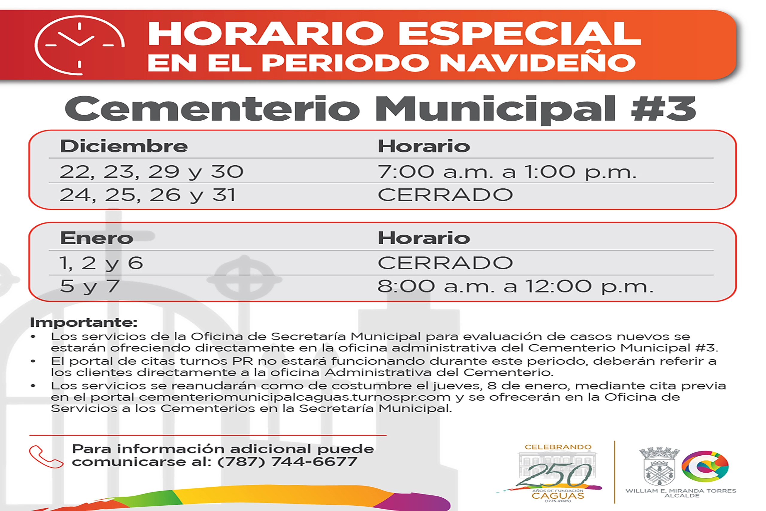 Los servicios de la Oficina de Secretaría Municipal para evaluación de casos nuevos se ofrecerán directamente en la oficina administrativa del Cementerio Municipal #3.