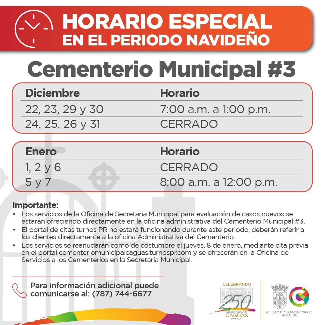 Aviso: El Cementerio Municipal #3 tendrá un horario especial durante el periodo navideño.