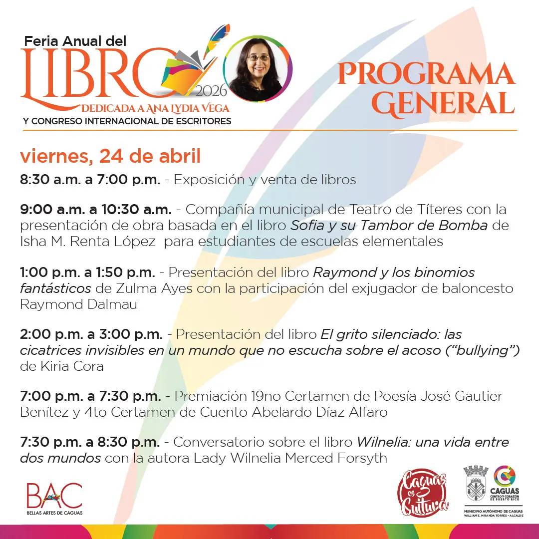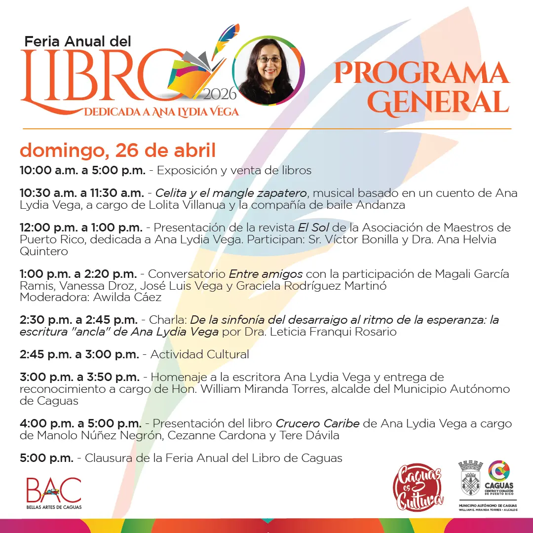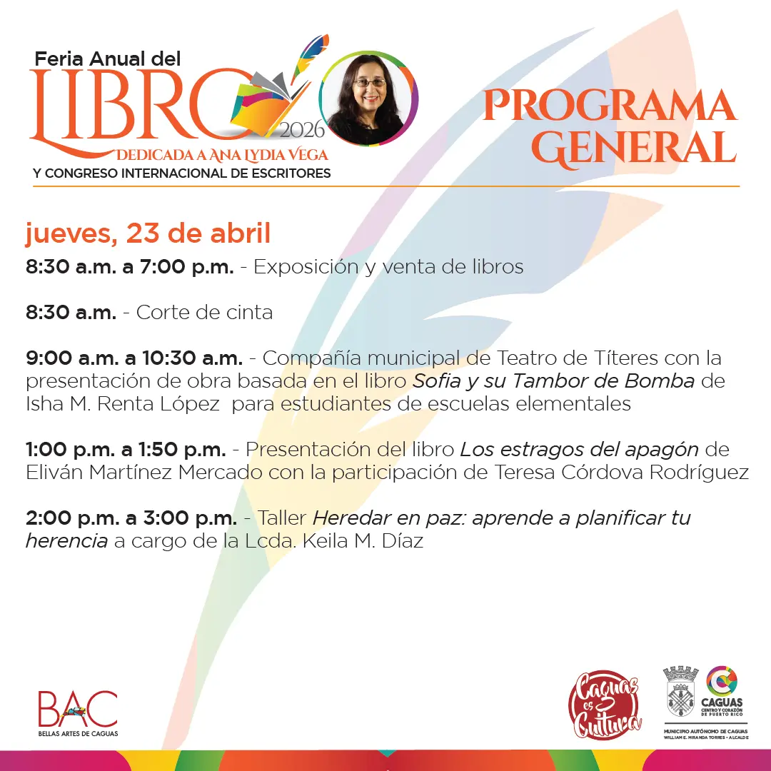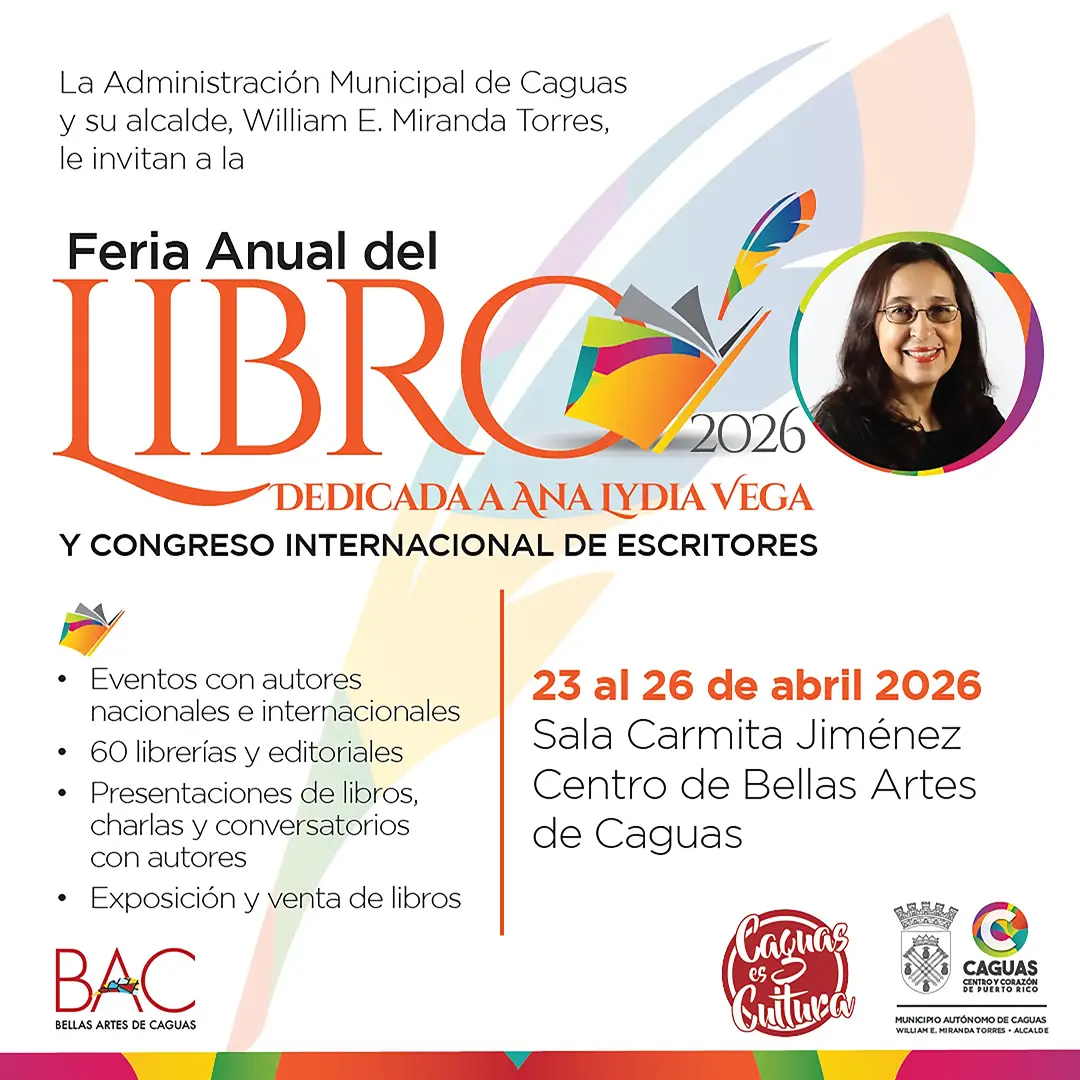 La Administración Municipal de Caguas y su alcalde, William E. Miranda Torres, invitan a la ciudadanía a disfrutar de la Feria Anual del Libro de Caguas 2026, que se celebrará del 23 al 26 de abril de 2026 en la Sala Carmita Jiménez del Centro de Bellas Artes de Caguas 🏛️📚.