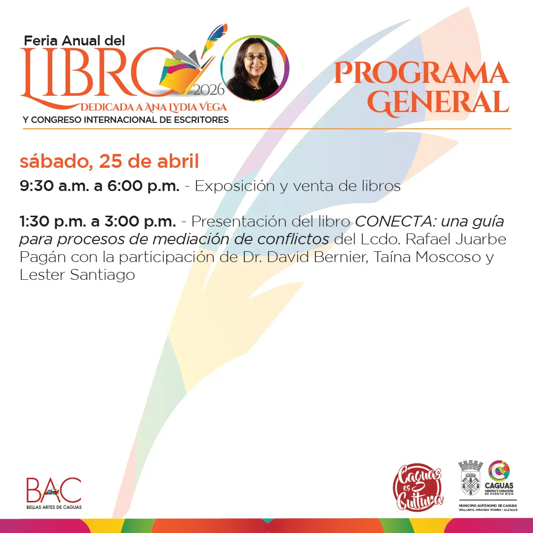 📘 1:30 p.m. – 3:00 p.m. | Presentación del libro CONECTA: una guía para procesos de mediación de conflictos del Lcdo. Rafael Juarbe Pagán, con la participación del Dr. David Bernier, Taína Moscoso y Lester Santiago