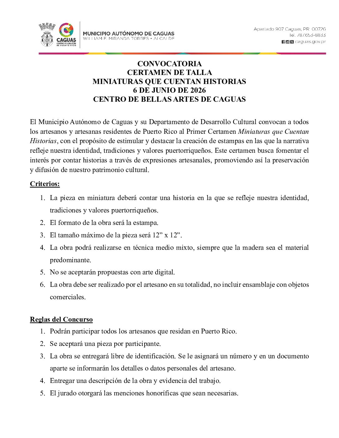 El Municipio Autónomo de Caguas y su Departamento de Desarrollo Cultural convocan a todos los artesanos y artesanas residentes de Puerto Rico al Primer Certamen Miniaturas que Cuentan Historias, con el propósito de estimular y destacar la creación de estampas en las que la narrativa refleje nuestra identidad, tradiciones y valores puertorriqueños. Este certamen busca fomentar el interés por contar historias a través de expresiones artesanales, promoviendo así la preservación y difusión de nuestro patrimonio cultural.