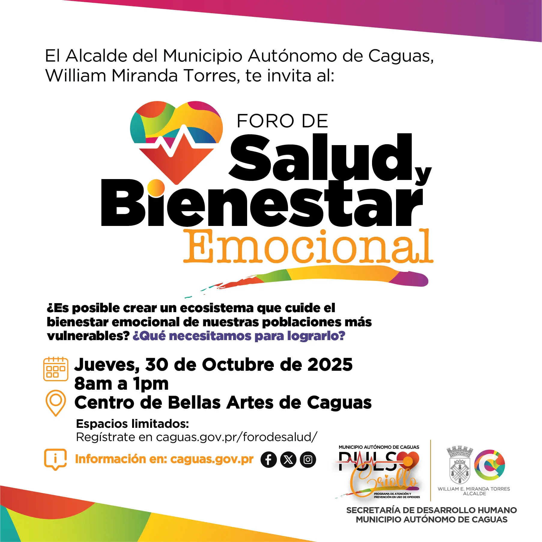 Les invitamos a ser parte de esta conversación el próximo jueves, 30 de octubre de 2025, a partir de las 8:00 de la mañana, en la Sala Carmita Jiménez del Centro de Bellas Artes de Caguas. Será un espacio para escucharnos, compartir aprendizajes y sembrar juntos las bases de un Puerto Rico más saludable, resiliente y humano.