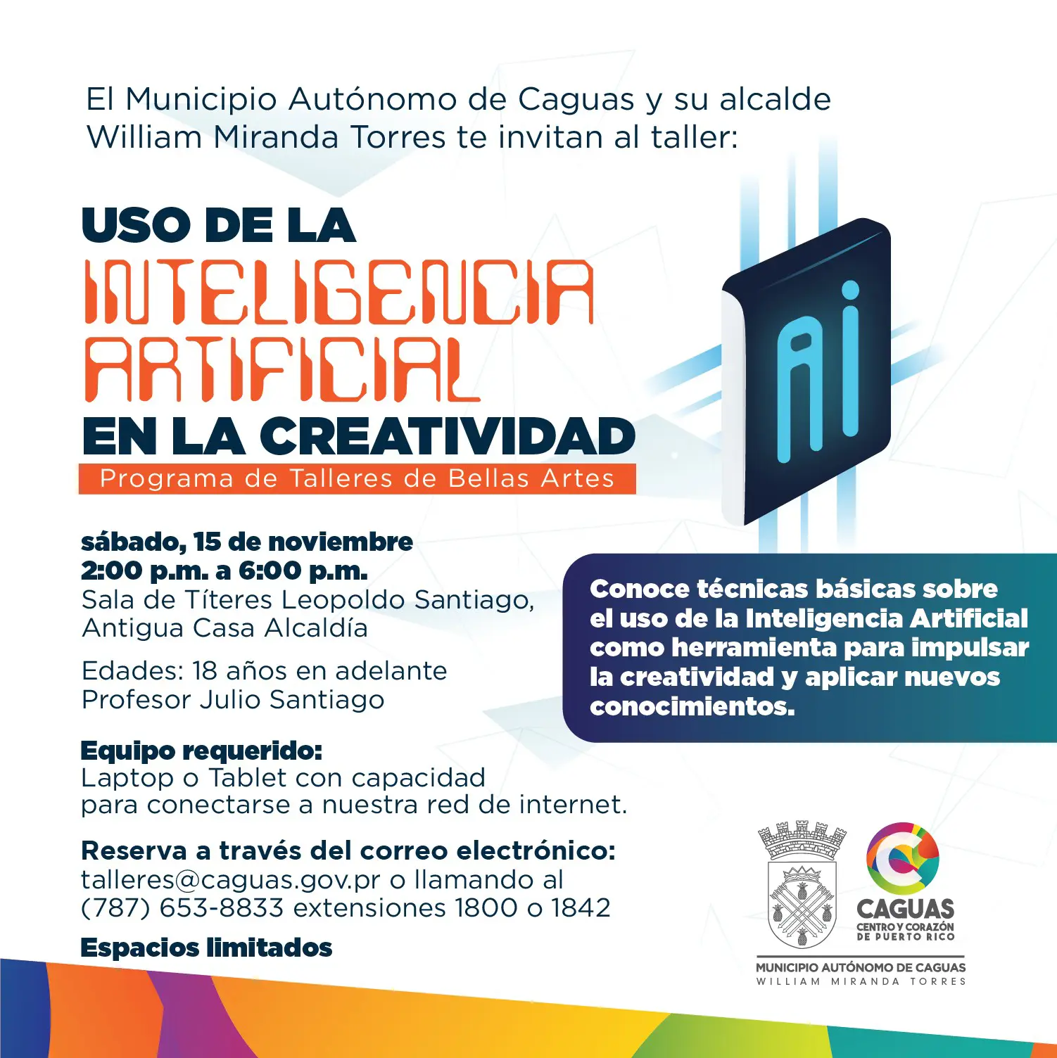 El Municipio Autónomo de Caguas y su alcalde William Miranda Torres te invitan al taller “Uso de la Inteligencia Artificial en la Creatividad”, como parte del Programa de Talleres de Bellas Artes.