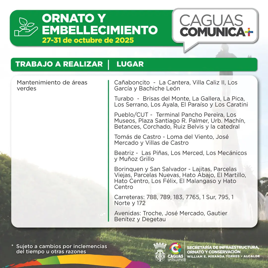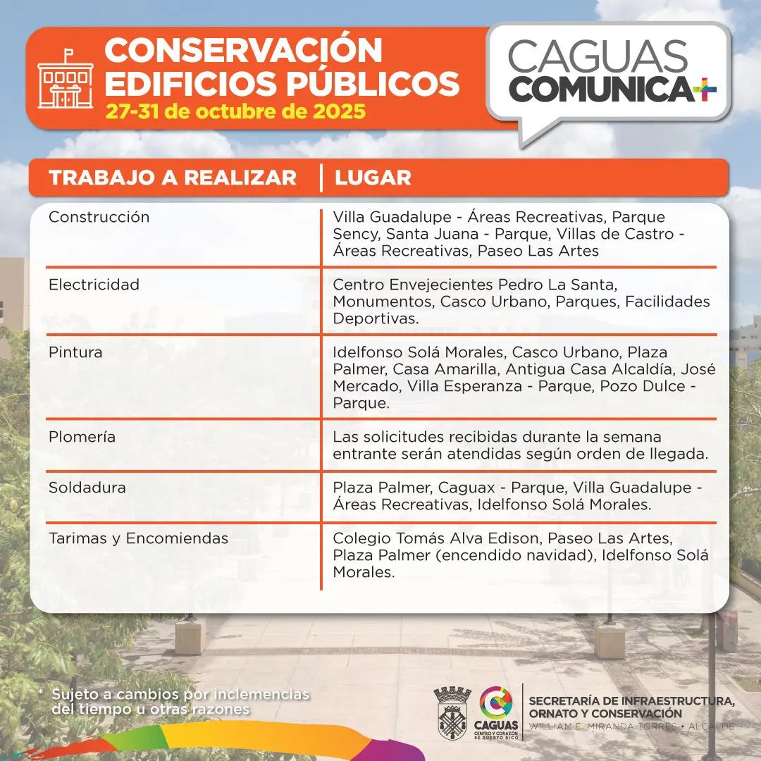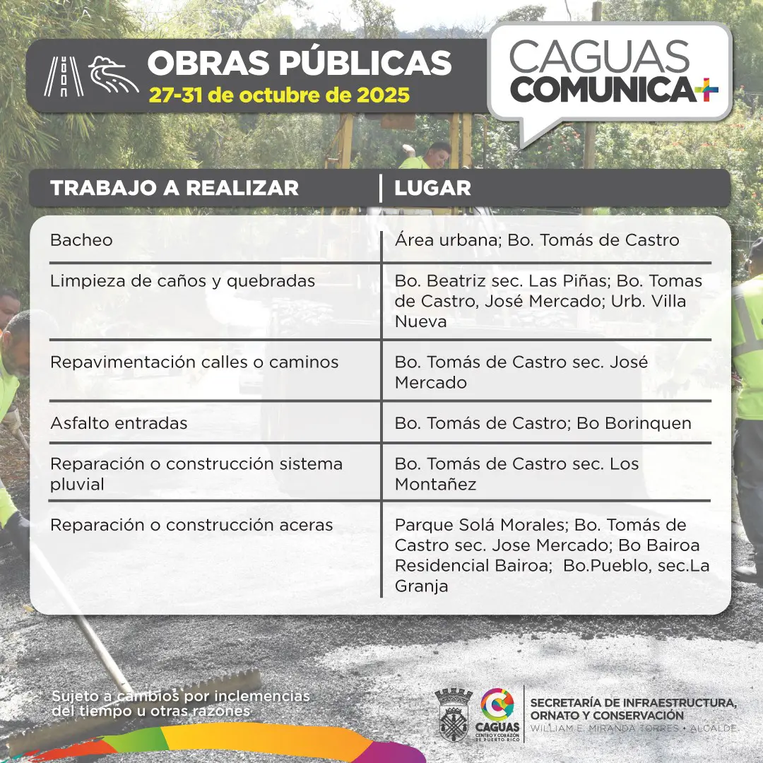 En Caguas, seguimos trabajando por una ciudad limpia, ordenada y funcional. Conoce las labores programadas para la semana del 27 al 31 de octubre de 2025, de la Secretaría de Infraestructura, Ornato y Conservación (SIOC)