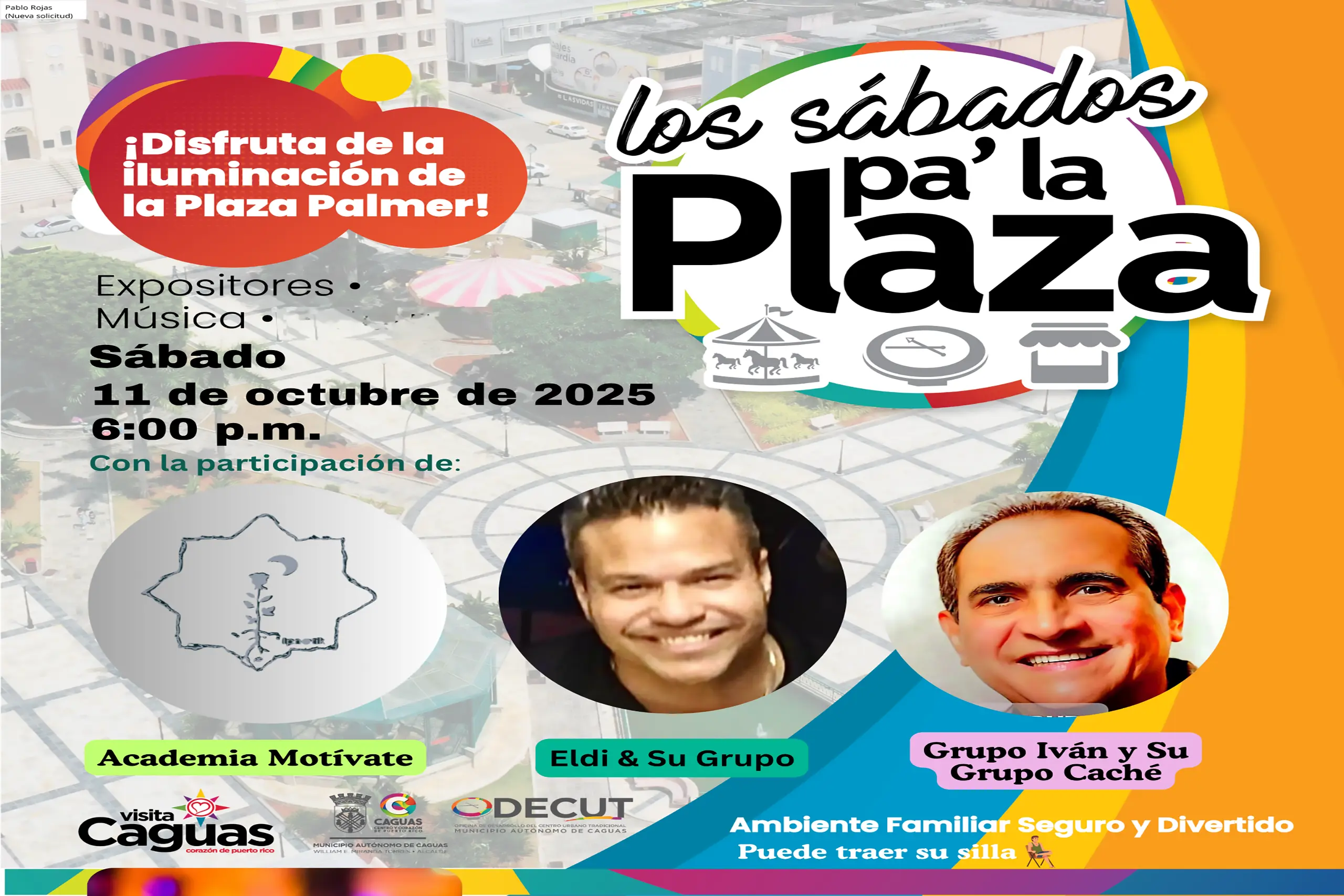 Ven y disfruta de “Los Sábados pa’ la Plaza” con música en vivo, expositores y la espectacular iluminación de la plaza. 📅 11 de octubre de 2025 🕔 6:00 p.m. 📍 Plaza Palmer, Caguas Con la participación de: Academia Motívate Eldi & Su Grupo Grupo Iván y Su Grupo Caché Disfruta del ambiente familiar, seguro y divertido que solo Caguas te puede ofrecer. ¡No olvides traer tu silla! [...]
