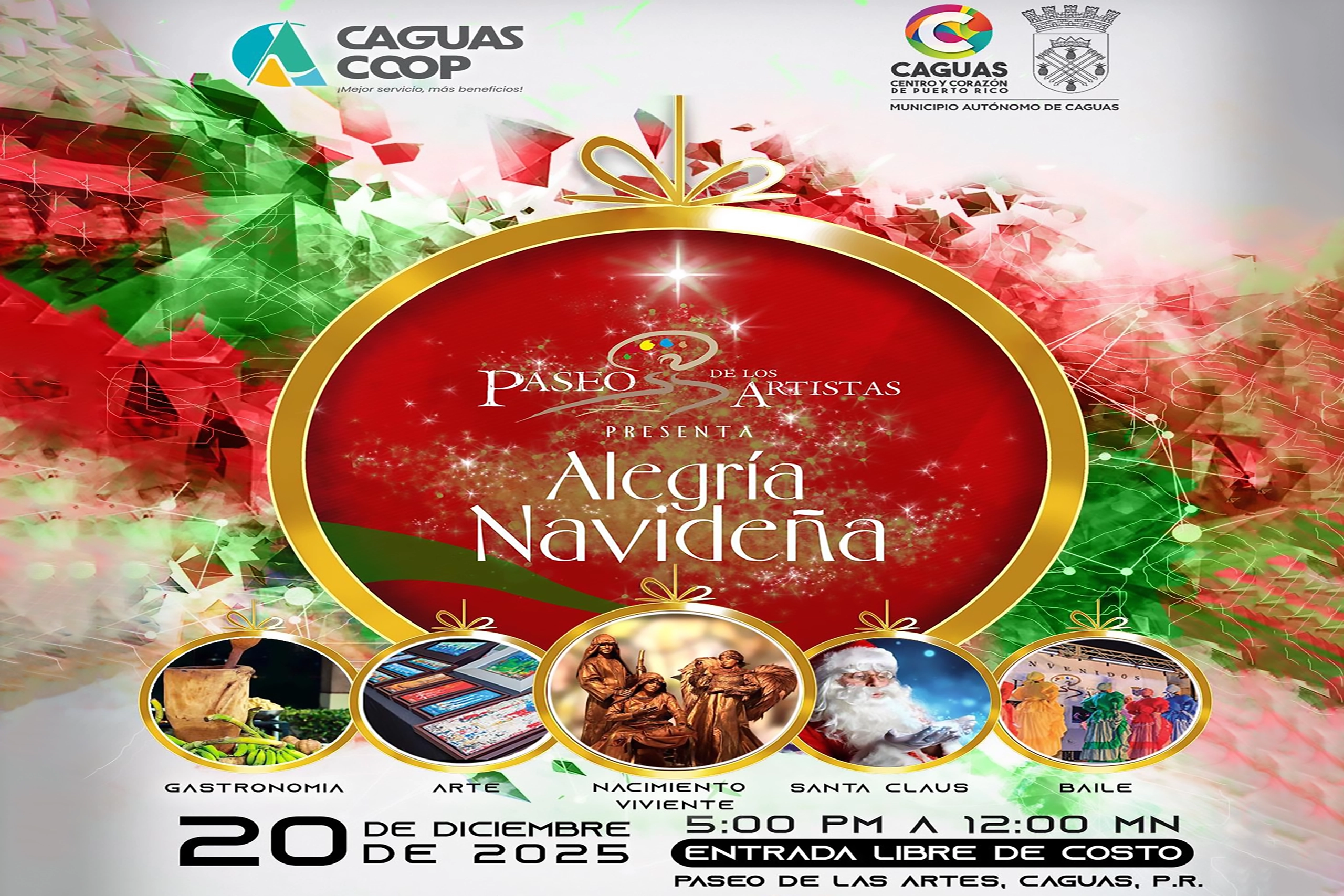 Este sábado, el Paseo de las Artes será el punto de encuentro para celebrar la tradición navideña en Caguas.Te invitamos a participar en Alegría Navideña, un evento del Paseo de los Artistas con 🎨Arte, 🍽️Gastronomía, 👶🐑🐪Nacimiento Viviente, 🎅Santa Claus, 💃 Baile.📅 Fecha: 20 de diciembre de 2025🕔 Hora: 5:00 p.m. – 12:00 a.m.📍 Lugar: Paseo de las Artes, Caguas, P.R.✅ Entrada libre de costo¡Ven con tu familia y amigos a [...]