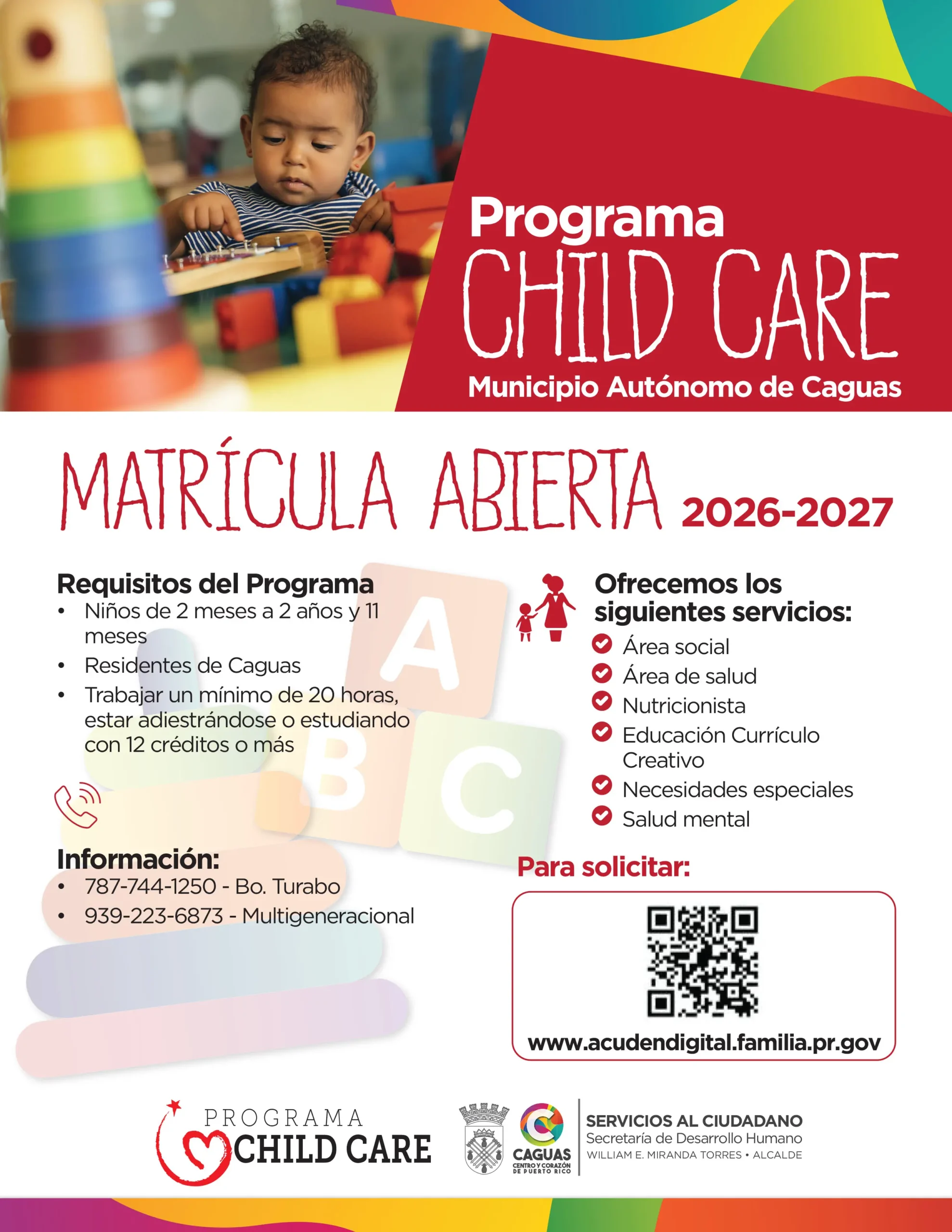 El Municipio Autónomo de Caguas, a través del Programa Child Care, informa que ya se encuentra abierta la matrícula para el año fiscal 2026–2027.