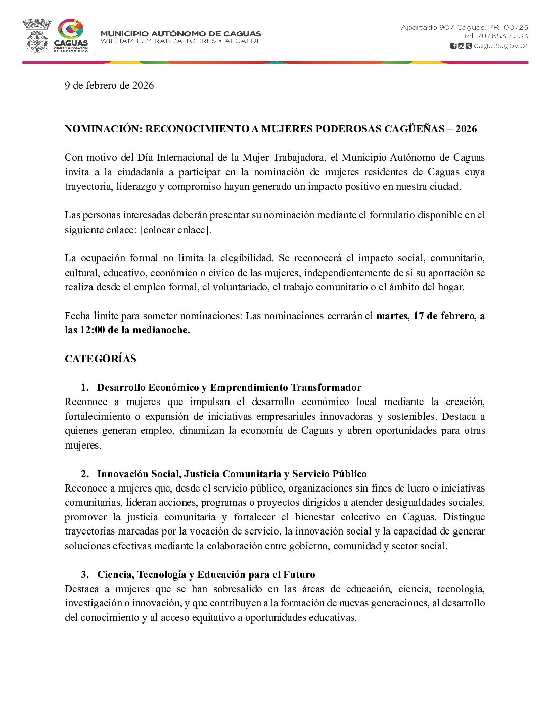 Con motivo del Día Internacional de la Mujer Trabajadora, el Municipio Autónomo de Caguas invita a la ciudadanía a participar en la nominación de mujeres residentes de Caguas cuya trayectoria, liderazgo y compromiso hayan generado un impacto positivo en nuestra ciudad.