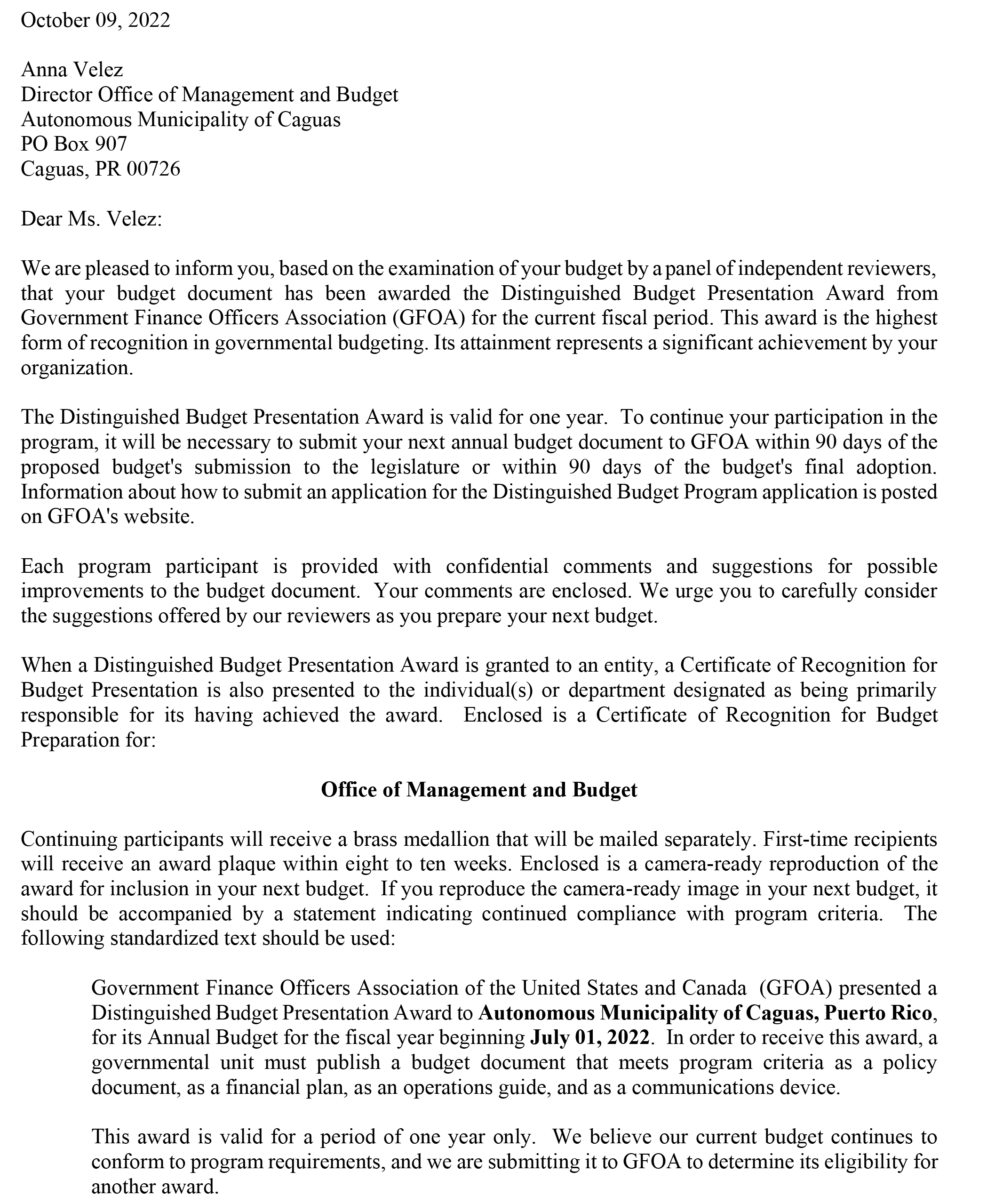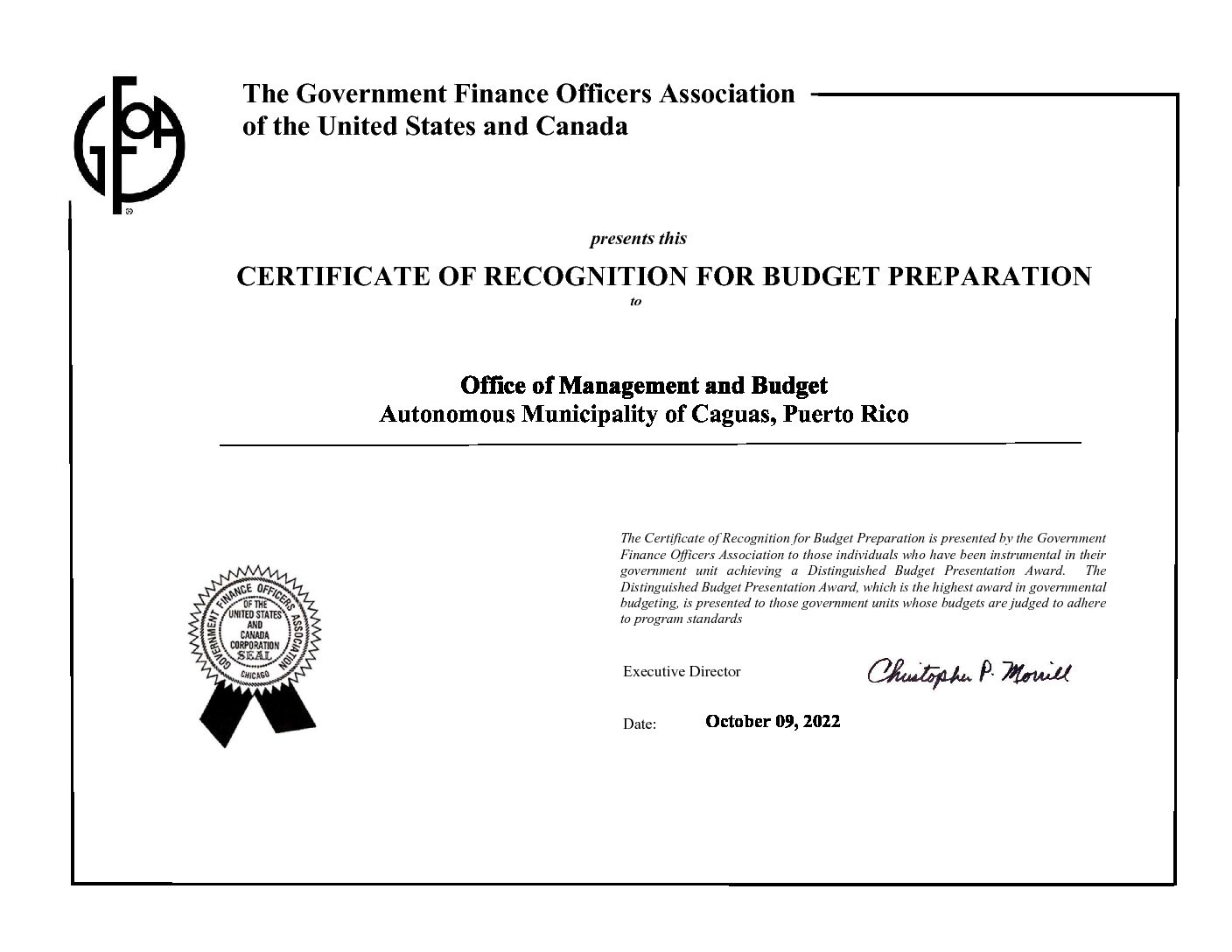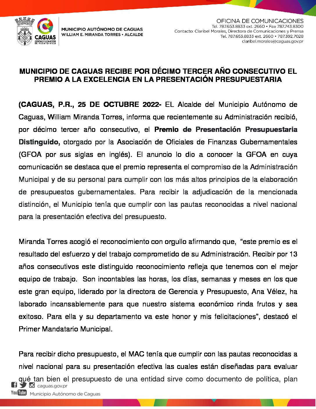 (CAGUAS, P.R., 25 DE OCTUBRE 2022- EL Alcalde del Municipio Autónomo de Caguas, William Miranda Torres, informa que recientemente su Administración recibió, por décimo tercer año consecutivo, el Premio de Presentación Presupuestaria Distinguido, otorgado por la Asociación de Oficiales de Finanzas Gubernamentales (GFOA por sus siglas en inglés). El anuncio lo dio a conocer la GFOA en cuya comunicación se destaca que el premio representa el compromiso de la Administración Municipal y de su personal para cumplir con los más altos principios de la elaboración de presupuestos gubernamentales. Para recibir la adjudicación de la mencionada distinción, el Municipio tenía que cumplir con las pautas reconocidas a nivel nacional para la presentación efectiva del presupuesto.