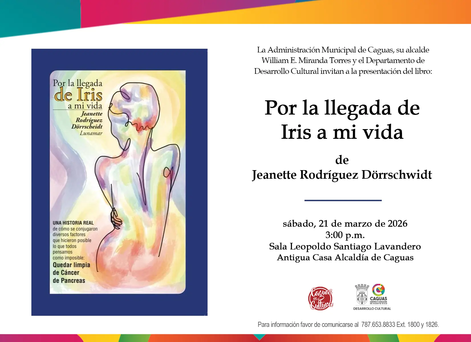 La Administración Municipal de Caguas, bajo el liderato del alcalde William E. Miranda Torres, junto al Departamento de Desarrollo Cultural, invita a la ciudadanía a la presentación del libro “Por la llegada de Iris a mi vida” de la autora Jeanette Rodríguez Dörschwidt.