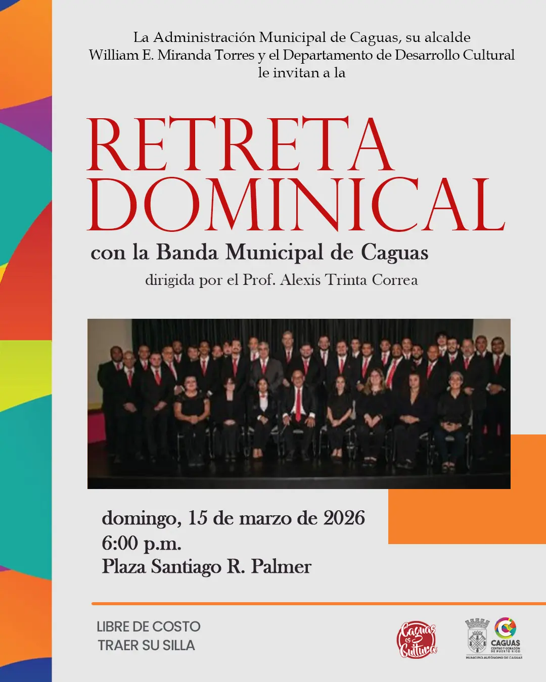 La Administración Municipal de Caguas y su alcalde, William E. Miranda Torres, junto al Departamento de Desarrollo Cultural, invitan a toda la ciudadanía a disfrutar de una Retreta Dominical con la participación especial de la Banda Municipal de Caguas, dirigida por el Prof. Alexis Trinta Correa. 🎺🎷